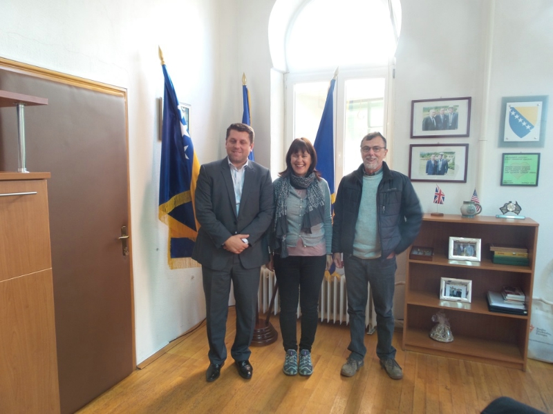 Alexandra Pöder (Land) und Maurizio Patat (Verein Beppe e Rossana Mantovan) mit dem Bürgermeister von Srebrenica Camil Durakovic (links).
