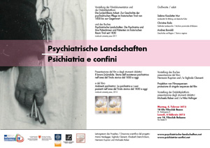 Aufgeklärtes Wissen um Geschichte und Gegenwart der Psychiatrie ist vergleichsweise gering. Das Interreg-Projekt "Psychiatrische Landschaften" hat es sich zum Ziel gesetzt, dies zu ändern, indem es mit einer Ausstellung und einer Open-Source-Dokumentation im Internet, mit einem Buch und einem Film auf Vermittlung im regionalen Raum setzt. Das Buch zum Projekt mit dem Titel "Psychiatrische Landschaften. Die Psychiatrie und ihre Patientinnen und Patienten im historischen Raum Tirol seit 1830" (innsbruck university press 2011) und die Filmdokumentation mit Didaktikplattform "Die [un]sichtbare Arbeit. Zur Geschichte der psychiatrischen Pflege im historischen Tirol von 1830 bis zur Gegenwart" werden