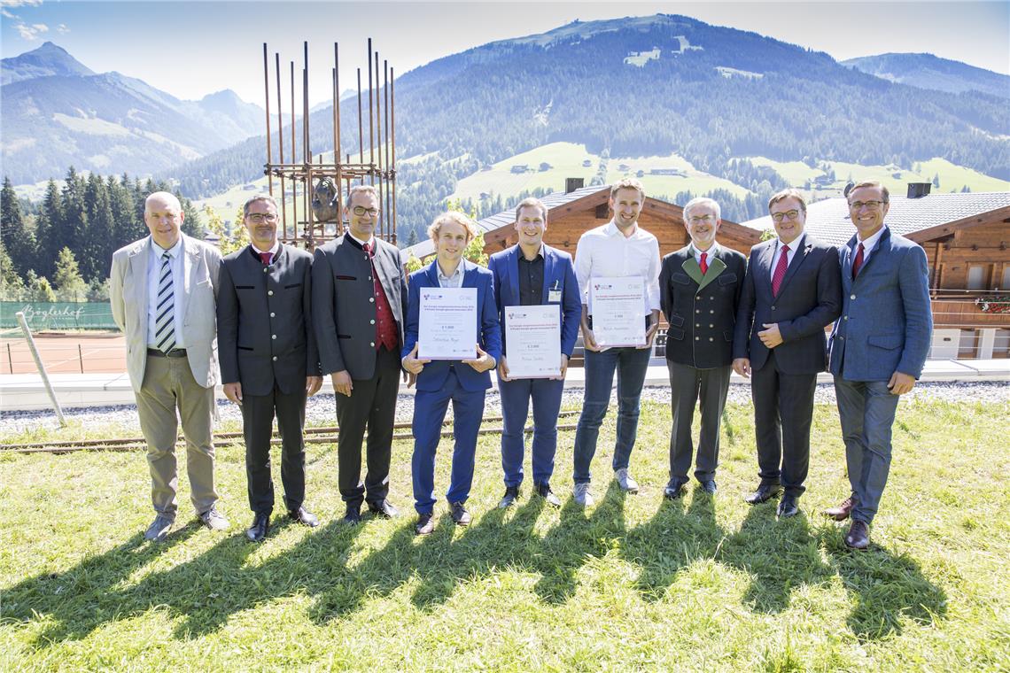 von links: Regionalratspräsident Roberto Paccher, LH Arno Kompatscher, Christoph Walser (Wirtschaftskammer Tirol), die Preisträger Sebastian Meyer, Michael Santek und Manuel Niederstätter, Michl Ebner (Handelskammer Bozen), LH Günther Platter, Jury-Präsident Josef Margreiter
