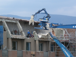 „Dank neuer Technologien können wir auch den Gebäudeabbruch situationsgerecht durchführen“, sagt Bautenlandesrat Mussner. Erstmals in Südtirol kommen die so genannten „Abbruchroboter“ zum Einsatz. „Das Krankenhaus ist ein sensibler Bau - die Dienstleistungen müssen trotz der Arbeiten gewährleistet werden. Außerdem sollen die Patienten nicht noch zusätzlich belastet werden. Aber auch die Ärzte sollen in ihrer wichtigen Arbeit so wenig wie möglich gestört werden“, erklärt der Landesrat. Die „Abbruchroboter“ helfen dabei. Sie brechen mit ihren Greifzangen nach einem genauen Plan kleine Portionen des Gebäudes ab. Die Abbruchstücke werden sofort in Schaufeln gesammelt und können somit nicht auf den Boden fallen. „Der Abbruch erfolgt also schonend und es entstehen weniger Staub, Lärm und Vibrationen als bei einem gewöhnlichen Abbruch“, sagt Mussner. Die Unannehmlichkeiten für die Patienten und das Krankenhauspersonal hielten sich in Grenzen. Darüber hinaus würden die Arbeiten nicht wesentlich verzögert.