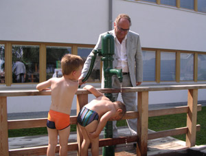 LPA – Das kühle Nass aus dem Brunnen im Garten des Kindergartens von Schluderns brachte gestern (28. Juli) die ideale Abkühlung für die 25 Kinder, die derzeit den Sommerkindergarten besuchen. Nicht nur die hohen Temperaturen, auch das vielfältige Angebot bringt in diesen Tagen die Kleinen ins Schwitzen. Da war es eine Selbstverständlichkeit, dass Landesrat Otto Saurer selbst Hand anlegte und bei den Vinschger Kindern mit einer Wasserdusche für einen kühlen Kopf sorgte.