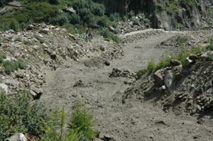Unter die Lupe genommen wurde dabei vor allem der Ausgangspunkt der Mure am Stockferner, einem Gletscher, der - weil stark geschrumpft und von Geröll bedeckt - als solcher kaum noch zu erkennen ist. An seinem unteren Ende stießen die Fachleute der Abteilung Wasserschutzbauten und des Hydrographischen Amtes auf ein großes, rund 20 Meter breites und sieben Meter hohes Tor. Bei genauerem Hinsehen entpuppte sich dieses als eingestürzte Kaverne, die ursprünglich geschlossen und aufgrund der Hitze in den vergangenen Wochen mit Schmelzwasser gefüllt war. "Ob der Wasserdruck die Gletscherkammer zum Einsturz brachte oder ob sie von selbst eingestürzt ist, kann im Nachhinein nicht mehr gesagt werden", erklärt Christoph Oberschmied vom Hydrografischen Amt. Wahrscheinlich ist allerdings, dass auf einen Schlag mehrere tausend Kubikmeter Wasser freigegeben worden sind. "Am meisten Material hat das Wasser auf einer Höhe von 2700 Meter mitgerissen, wo es bis zu zehn Meter tiefe Gräben in relativ jungen Moränenschutt gerissen hat", so Staffler.