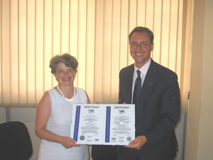 Die Gratulation von Landesrätin Gnecchi zur TÜV-Zertifizierung und das Zertifikat selbst betrachtet Eisenbahndirektor Hopfinger als Ansporn, die Qualität der Dienste von Trenitalia weiter zu verbessern.