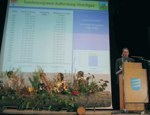 Zwanzig Jahre Sonderprogramm zur Aufforstung des oberen Vinschgaus, vor allem der waldarmen Gebiete in Matsch, Planeil, Schlinig und Langtaufers, bedeuten zwei Millionen neue Pflanzen, 500 Hektar aufgeforstete Fläche, 130 Kilometer neue Wasserleitungen aber auch neue Natursteinmauern, Steige, Zäune und Almen, führte heute der Koordinator des Sonderprogramms, Andreas Feichter vom Forstinspektorat Schlanders, aus. "Die Mitarbeiter des Forstinspektorates Schlanders und die vielen Forstarbeiter, die in all den Jahren an der Aufforstung gearbeitet haben, können stolz auf das Geleistete sein", so Durnwalder in seiner Festrede, "stolz auch auf den Beitrag zu Landschaftspflege, Erosions- und Umweltschutz."