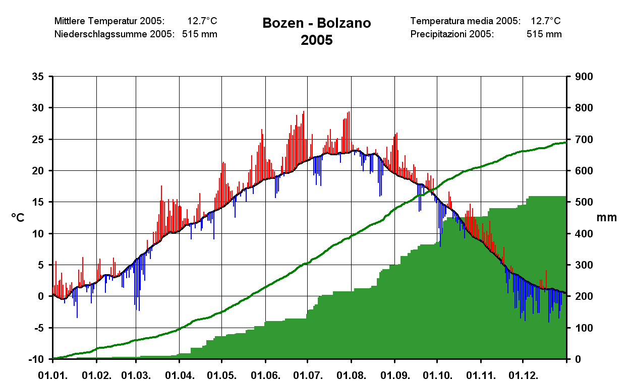 Klimadiagramm des Jahres 2005 der Station Bozen. Die schwarze Linie zeigt die durchschnittliche Tagestemperatur von 1967 – 1996. Die roten und blauen Balken zeigen die täglichen Abweichungen der Temperaturen des Jahres 2005. Die grüne Linie stellt den mittleren Niederschlag der Jahre 1967 – 1996 dar. Die grüne Fläche ist der aufsummierte Niederschlag des Jahres 2005.