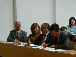 IME-Präsident Stifter, LRin Kasslatter Mur, LR Saurer und Schulamtsleiter Stifter bei der Tagung über die musikalische Erziehung