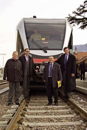 LPA - "Als Leitprojekt der modernen Südtiroler Verkehrspolitik" hat Mobilitätslandesrat Thomas Widmann heute (Freitag, 28. Januar) in Latsch die neue Vinschger Bahn präsentiert. Gemeinsam mit Landesrat Richard Theiner, Ressortdirektor Gianfranco Jellici und Projektleiter Helmuth Moroder gab der Mobilitätslandesrat nicht nur Einblick in Betrieb und Funktion der Bahn sondern auch in die Verkehrseinbindung und die Bewerbungsstrategien.
