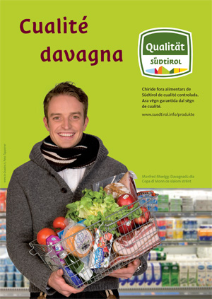 USP – La campania nueva de promozion de prudoc cun la merca de cualità Südtirol ie nce unida fata per ladin. Cun l moto “Cualité davagna” fej l campion de schi Manfred Mölgg promozion per ladin.