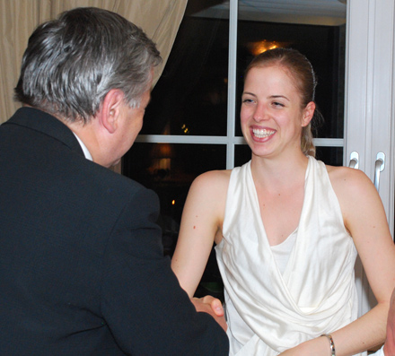 L Presidënt à bele fat i auguresc scric per la bedaia d’or, sorissan che la jëuna de Gherdëina ie n atleta straurdinera, ma che la ie purempò daniëura n ejëmpl per atlec plu jëuni. „Son dla minonga che nosc talënc plu jëuni possa se cialé ju velch da Carolina Kostner, n cont de tan lonc che n possa ruvé sce n à la mentalità aldò“ dij Durnwalder. Ai auguresc dl presidënt se jonta nce chëi dl assessëur ladin Florian Mussner, che sorissea la legrëza y l stolz dla jënt de Gherdëina per l atleta che reprejentea la cumenanza ladina danter duc i nteressei y pasciunei dl jadiné.
