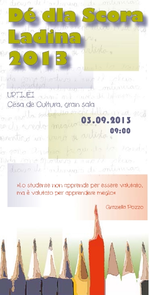 Dan che scumëncia l ann de scola nuef, se anconta i respunsabli y culaburadëures dla scoles ladines n merdi che vën, ai 3 de setëmber per n danmesdì de ajurnamënt y de cuntat danter valedes ladines. L Di dla Scola Ladina vën chëst ann tenì tla scola elementera de Urtijëi. Chësc di de cunferënza unirà giaurì cun rujenedes dl assessëur ladin Mussner y dl ntendënt Verra. Ntan chësc danmesdì puderà duc i nteressei nce audì n referat sun la funzion dla valutazions di sculeies.