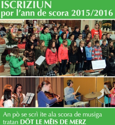Ćina la fin de merz pon se scrì ite por l’ann 2015/16 dles scores de musiga y por les edemes da d’isté 2015. Les iscriziuns por les scores de musiga dla Val Badia y de Gherdëna mëss gnì dades jö tles döes direziuns cun sënta a La Ila y a Urtijëi.