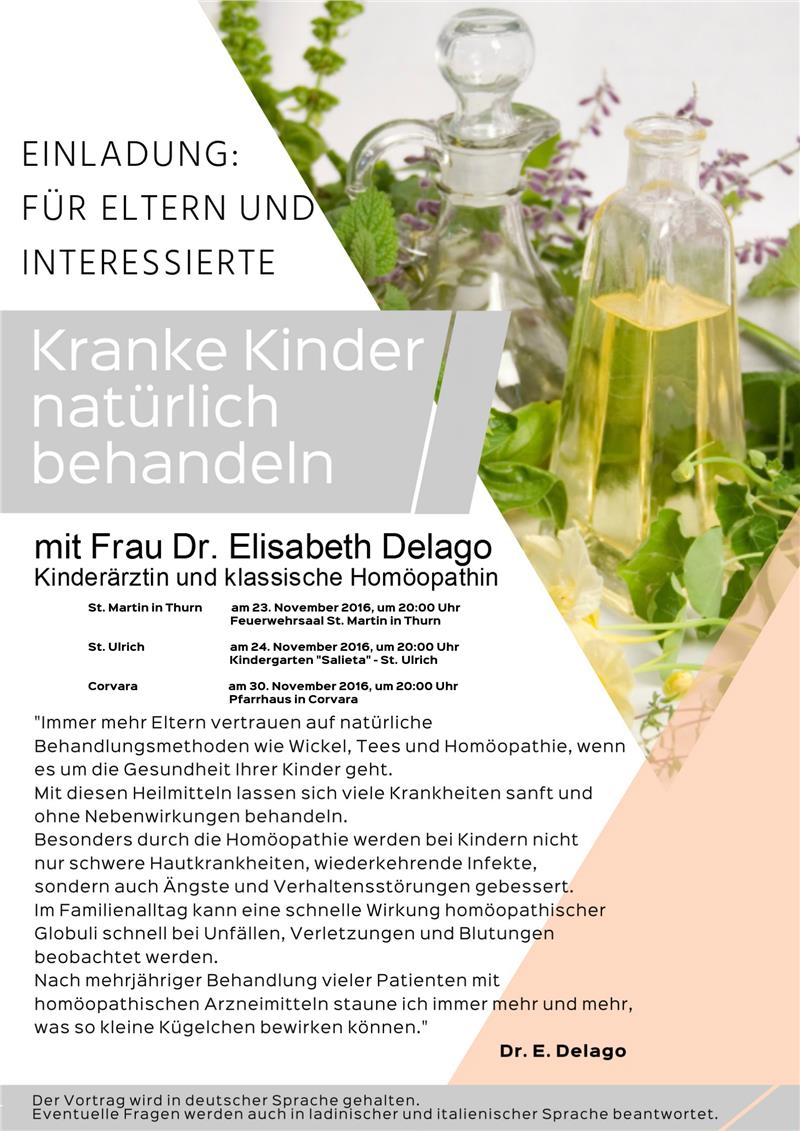 Tres de plü geniturs ti á crëta a metodes de cura naturales canche ara nen vá da socodí les mitans y i mituns amará. Por ti pité ai geniturs na suraodüda generala de chësta tematica él la Direziun dles scolines ladines che mët da jí de plü sëres d’informaziun a San Martin de Tor, a Urtijëi y a Corvara cun la pediatra de omeopatia classica y doturia Elisabeth Delago. L'esperta tignará por l'ocajiun n referat dal titul „Kranke Kinder natürlich behandeln“. Al gnará rajoné dles metodes naturales da curé maraties, sciöche por ejëmpl le infascé ia, i tês da bëre y la homeopatia classica. Le referat sará por todësch, naturalmënter podarál gní fat domandes ince por ladin y talian. Inviá é düc i geniturs che á de piceres mitans y mituns, nia ma dl’eté dla scolina mo ince surafora sciöche ince düc chi che é interessá ala materia.