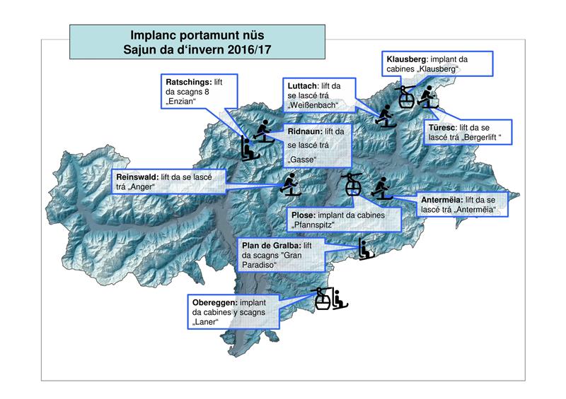 „Al é dër positif che al é sté meso da stlü jö i laurs de realisaziun di implanc portamunt nüs dan le scomenciamënt dla sajun da d’invern“, dij l’assessur por la mobilité Florian Mussner. De conseguënza é düc i cinch lifc dai scagns y implanc a cabines sciöche ince i cinch lifc da se lascé trá en funziun. „Dantadöt i lifc da se lascé trá ti pici zëntri di paisc á n’importanza soziala dër alta, deache ai ne favorësc nia ma l’imparé da jí cui schi mo ince les incuntades danter les generaziuns“; insciö Mussner.