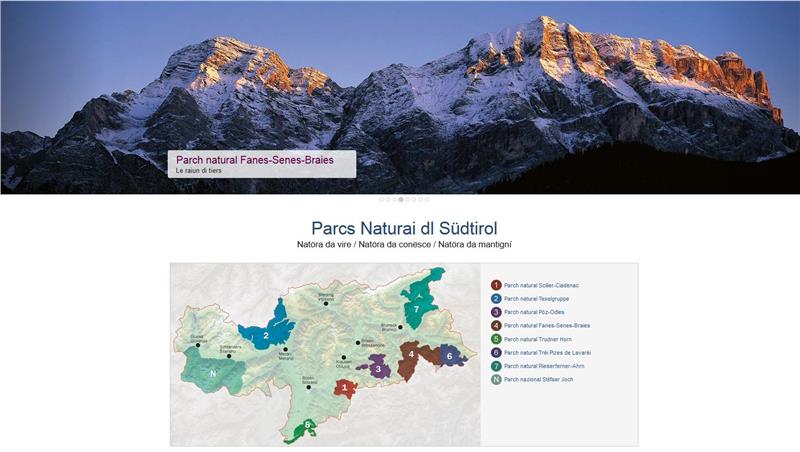 I set parcs naturai, plü la pert südtiroleja dl parch nazional dl Stelvio: chësc é le contignü prinzipal dla plata internet nöia dedicada ai parcs naturai y che é online dai 14 de merz ala misciun http://parcs-naturai.provinzia.bz.it. De plü é ince i contignüs por ladin y che reverda dantadöt le parch natural Fanes-Senes-Braies y le parch natural Pöz-Odles cun informaziuns d’ütl sön le habitat, stüdi, relevamënc, escursciuns acompagnades fora por la natöra y rodes tla natöra.