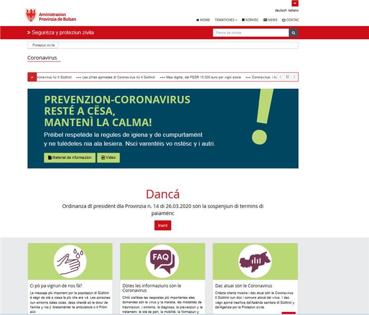 Implü él da ciafé dötes les ordinanzes y comunicaziuns, i documënc y le material informatif dla campagna cuntra le Coronavirus. Sön le medem sit ciafon spo ince le documënt dla autozertificaziun por todësch y talian. La plata por ladin é gnüda realisada tl Ofize Chestiun linguistiches dla Provinzia adöm cun le sostëgn tecnich dla SIAG y dla Ajentöra de stampa dla Provinzia.