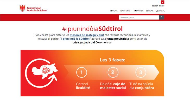 Sön la plata internet nöia dla Junta provinziala él dötes les mosöres de sostëgn y aiüt, che la junta provinziala aprovëia por ti ester ala crisa gaujada dal Coronavirus. Ara se trata de n pachet de mosöres che reverda l’economia, les families y le sozial y á inom „#ipiunindôiaSüdtirol“. La plata web é te düc trëi i lingac dla provinzia y i contignüs vëgn ajorná tresfora.