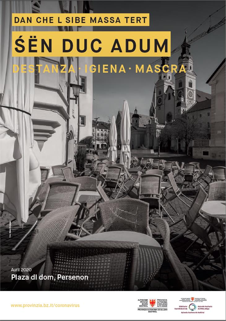 La campagna de comunicaziun orüda dala Junta provinziala en colaboraziun cun l’Aziënda sanitara é piada ia. Le messaje prinzipal é chël da ponsé do sön les conseguënzes che le Covid-19 á sön la vita da vigni de y sön l’importanza da respeté les püces regoles tleres dades dant. Por la campagna él gnü chirí fora fotografies fates tratan le lockdown tl Südtirol y le messaje é tler: düc dess tigní adöm y respeté les regoles a na manira che an ne röies nia plü tla situaziun sciöche da d’aisciöda dl 2020. Al vëgn insciö damané da respeté les regoles che reverda la destanza danter les porsones, l’igiena dles mans y l’oblianza da adoré la maschera por curí bocia y nes.