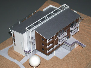 L model dla cësa per studënc a Urtijëi.A Urtijëi ulëssa la Provinzia fé na cësa per i studënc tla streda Sortia, dlongia la Scola d’Ert. L proiet vëija dant 16 majons da doi per studënc y cin majons singules per nsenianc che dëssa giapé lerch dal prim al terzo partimënt. Bas ite ulëssen fé na mensa per 66 persones y sota tiera n garasc cun 15 lueges.