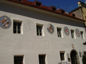 Si tratta di cinque affreschi che raffigurano gli stemmi di cinque abati dell'Abbazia di Novacella, che si sono succeduti alla guida dell'Abbazia tra il 1721 ed il 1787, che decoravano quella che fu la sede amministrativa del convento agostiniano, "Neustifter Amtshaus", e che raccontano una sorta di storia della proprietà.