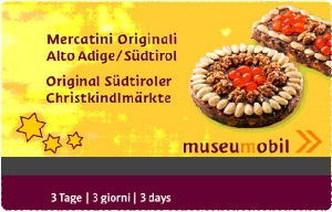 La Museumobil Card permette, con un unico biglietto, di entrare in circa 80 musei e utilizzare tutti i mezzi pubblici dell’Alto Adige per 7 o 3 giorni. Dal 1° novembre 2012 al 6 gennaio 2013, la museumobil Card da 3 giorni sarà in vendita in una simpatica edizione natalizia.