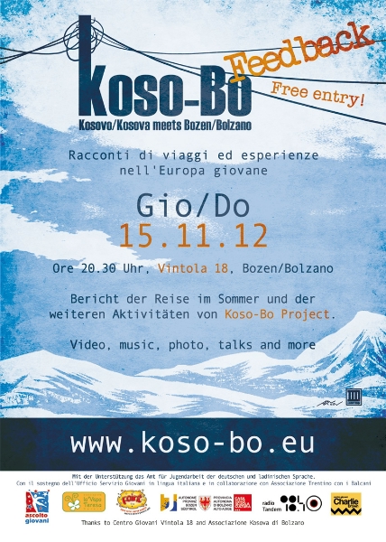 Appuntamento per la serata-spettacolo dal titolo "Koso.Bo feedback - Racconti di viaggi ed esperienze nell'Europa giovane" giovedì prossimo 15 novembre 2012, alle 20.30, Centro Vintola 18, in via Vintola 18 a Bolzano. L'ingresso è libero.