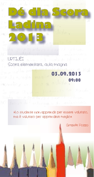 La Giornata della scuola ladina è diventata ormai un appuntamento fisso che si svolge in concomitanza con l'avvio dell'anno scolastico. Quest'anno l'incontro aperto a insegnanti, dirigenti, genitori e personale amministrativo avrà come tema di riferimento il rapporto tra apprendimento e valutazione. La manifestazione, alla quale prenderà parte il presidente della Provincia Luis Durnwalder, e che sarà aperta dall'assessore alla scuola e cultura ladina Florian Mussner, avrà luogo
