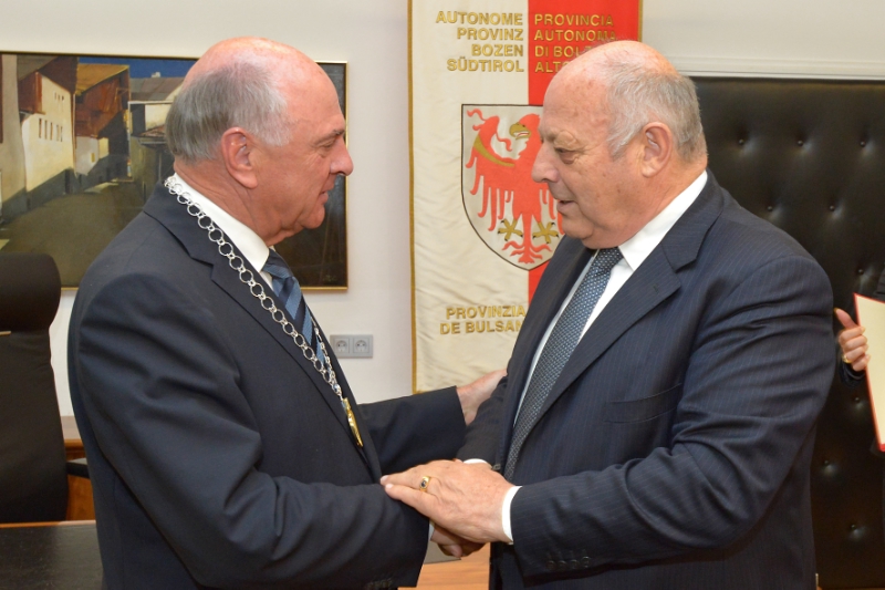 Il Grande ordine di merito della Provincia di Bolzano viene conferito a personalità non altoatesine che hanno contribuito significativamente alla crescita e allo sviluppo dell'Alto Adige. Tra i 12 insigniti di quest'anno c'è anche il governatore dell'Austria inferiore Erwin Pröll, che però non aveva potuto presenziare alla cerimonia del 5 settembre scorso a Castel Tirolo. Oggi (30 ottobre) a Palazzo Widmann c'è stato l'incontro tra i due Presidenti con la consegna dell'onorificienza. "Se l'Alto Adige vanta standard elevati tra le Regioni europee lo deve anche alla collaborazione con altre realtà territoriali - ha detto nel suo discorso Durnwalder - e una di queste è indubbiamente l'Austria inferiore, una regione che funge da esempio."