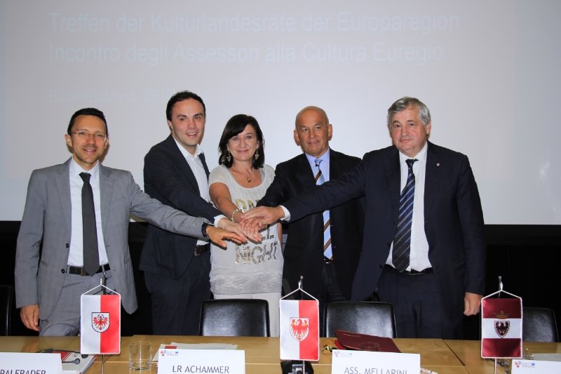 Gli assessori alla Cultura dell'Euregio, Christian Tommasini, Philipp Achammer, Florian Mussner (Provincia di Bolzano), Beate Palfrader (Land Tirol) e Tiziano Mellarini (Provincia di Trento), nel primo incontro di lavoro congiunto nella sede del GECT all'EURAC a Bolzano, hanno siglato oggi (28 agosto) l'"Accordo cultura" per l'intensificazione della collaborazione in ambito culturale.