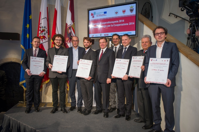 A Landeck, Kompatscher, Platter e Rossi hanno infine consegnato il neoistituito Premio Euregio per la cooperazione, "un ulteriore segnale del futuro comune delle tre Province." È suddiviso in due categorie: i progetti già in corso o conclusi e quelli da attuare. Complessivamente 56 le candidature, tra i progetti già avviati sono stati premiati il pacchetto di azioni per far rivivere la Via Claudia Augusta dal Danubio all'Adriatico, il progetto di post-trattamento del biogas nelle Alpi che riduce le emissioni nocive (tra i partner Atzwanger e LUB), il sistema "Originalp" per controllare origine e qualità dei prodotti regioni alpini mediante spettroscopia (tra i partner LUB, Centro Laimburg, Federazione latterie Alto Adige). Il primo premio per le idee innovative da attuare è andato invece al progetto dello studente della LUB Emanuel Valentin di utilizzare i sistemi di digitalizzazione e il crowdsourcing per creare una piattaforma online e raccogliere i dati digitalizzati del patrimonio culturale dell'Euregio. Tramite il "portale del patrimonio culturale" il cittadino potrà accedere a tutto il materiale digitalizzato esistente in biblioteche, archivi e musei dell'Euregio.
