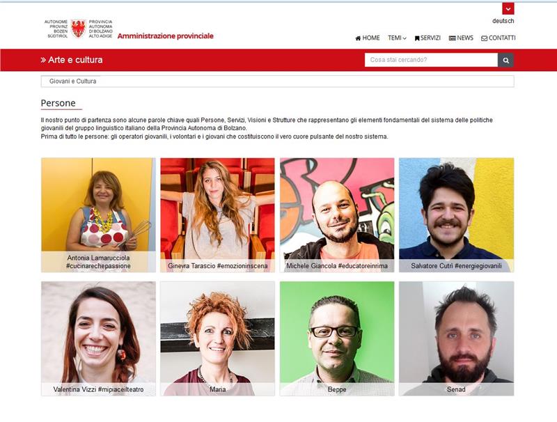 La nuova campagna del Servizio Giovani per raccontare le politiche giovanili attraverso i suoi protagonisti, denominata #talkingpeople, si struttura in “video pillole”, interviste e fotografie che raccontano le storie di tutte quelle persone che gravitano nell’orbita del Servizio Giovani e il cui contributo è decisivo per gli interventi della Provincia in favore dei giovani. Incentrata sulle persone e sulle loro voci, la campagna questa settimana presenta Antonia Lamarucciola, referente del Centro giovani "Melograno" di Bolzano, che si potrà conoscere cliccando il link alla pagina pagina web del Servizio Giovani, sezione persone: http://www.provincia.bz.it/arte-cultura/giovani/persone.asp e vedere e ascoltare scegliendo il link