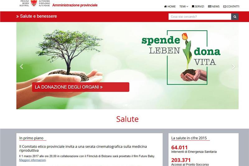 Fornire ai cittadini e al personale sanitario una serie di informazioni utili e importanti sul tema della sanità: dalle strutture ai servizi, dalla prevenzione alle più diverse iniziative. Tutto questo raccolto in un portale web interamente dedicato alla salute e online da oggi (3 marzo) all'indirizzo www.provincia.bz.it/salute. "Grazie ad un nuovo layout più chiaro e semplice - commenta l'assessora Martha Stocker - riusciamo a dare maggiore visibilità anche alle nostre campagne di sensibilizzazione, come ad esempio quelle sulla donazione degli organi, sulla lotta alla dipendenza dall'alcool e su uno stile di vita sano". Oltre a ciò, i cittadini possono trovare in maniera immediata notizie di pubblico interesse come, ad esempio, le farmacie e i medici di turno, il piano delle vaccinazioni o il piano sanitario 2016-2020, mentre sono diverse le sezioni dedicate specificatamente al personale sanitario, alle aziende e ai liberi professionisti, con servizi e modulistica consultabili online.