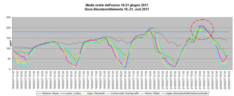 Valori dell'ozono nuovamente oltre la norma, ed è il secondo giorno di fila, in Alto Adige. Nella serata di ieri (martedì 21 giugno), la soglia di informazione di 180 microgrammi di ozono per metro cubo d'aria è stata ampiamente superata in cinque delle stazioni di misura presenti sul territorio altoatesino, con valori in crescita rispetto al giorno precedente. Il valore più alto è stato quello di Renon, con una concentrazione oraria massima di 210 microgrammi per metro cubo tra le 19 e le 24, seguita da Laives (massima concentrazione oraria di 208 microgrammi per metro cubo tra le 18 e le 23), Cortina sulla strada del vino (205 microgrammi per metro cubo tra le 18 e le 21), Egna (204 microgrammi per metro cubo tra le 18 e le 21) e Bolzano (200 microgrammi per metro cubo tra le 19 e le 23).