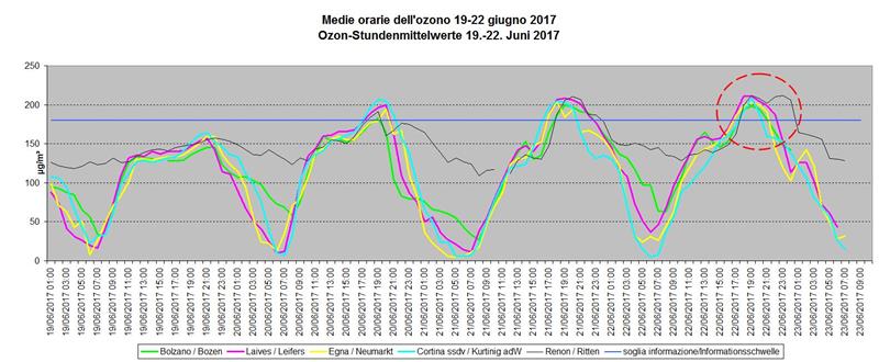 Con il permanere delle elevate temperature e dell’insolazione negli ultimi giorni permangono alte anche le concentrazioni di ozono. Il Laboratorio provinciale di chimica fisica informa che ieri (22 giugno) è stata superata la soglia di informazione di 180 µg/m³ in 5 stazioni di misura in Alto Adige: a Egna dalle ore 18 alle 23 (massima concentrazione oraria 203 µg/m³), a Cortina sulla strada del vino dalle 19 alle 22 (massima concentrazione oraria 208 µg/m³), a Bolzano dalle 19 alle 23 (massima concentrazione oraria 198 µg/m³), a Laives dalle 18 alle 24 (massima concentrazione oraria 211 µg/m³) e sul Renon dalle 19 alle 2 di stanotte (massima concentrazione oraria 212 µg/m³).