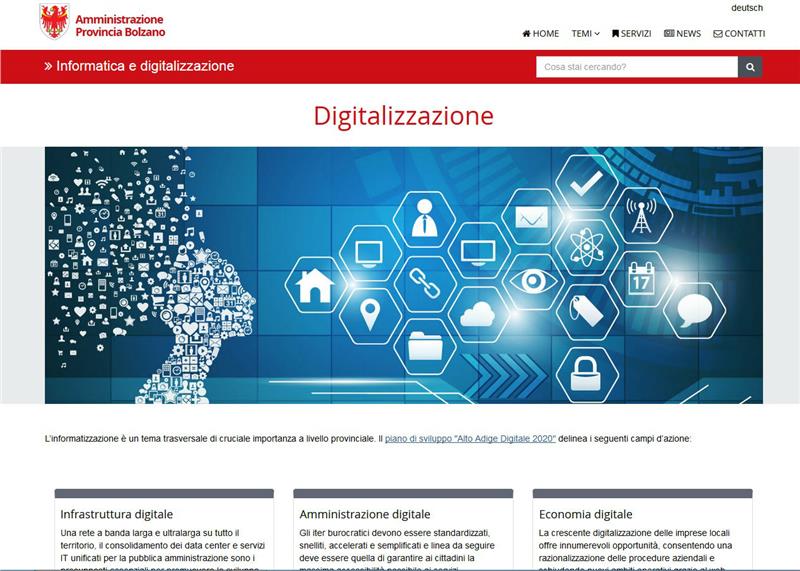 www.provincia.bz.it/digitalizzazione è l'indirizzo della nuova pagina Internet attiva da oggi, dove i cittadini trovano tutte le informazioni e gli aggiornamenti sul processo di digitalizzazione in corso in Alto Adige. La nuova pagina web segue le linee guida dello sviluppo digitale Alto Adige Digitale 2020. Le tematiche descritte in dettaglio sono infrastruttura digitale, amministrazione digitale, formazione digitale, economia digitale, governance IT e open data. "La digitalizzazione pone l'Alto Adige davanti a grandi sfide, si pensi solo all'ampliamento della banda larga, al potenziamento dei servizi eGov della pubblica amministrazione, ma anche alla formazione digitale della popolazione", sottolinea l'assessora provinciale all'IT Waltraud Deeg. La trasformazione digitale è il futuro, "e su questa strada vogliamo accompagnare gli utenti. Le nuove pagine web sono un prezioso aiuto e un passo importante verso un'amministrazione moderna e vicina al cittadino", aggiunge Deeg.