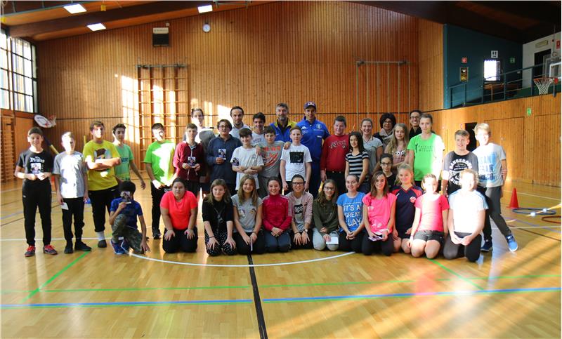 Prima visita nell'ambito del progetto "Lo sport fa scuola": lo snowboarder Roland Fischnaller in visita alla scuola media di Terlano.