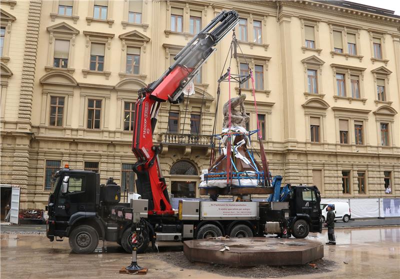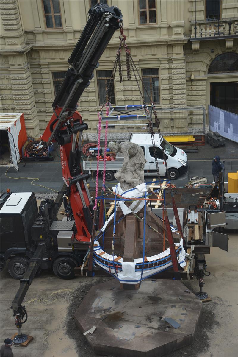 Sono cominciati questa mattina (12 aprile) e sono terminati nel tardo pomeriggio in piazza Magnago i lavori per lo spostamento della statua di Re Laurino dall’attuale collocazione a quella temporanea nel parco di piazza Stazione. "Si tratta di un un’operazione delicata – spiega Irene Braito dell'Ufficio edilizia est, responsabile del progetto di riqualificazione della piazza – anche alla luce dello stato di conservazione del manufatto che presenta già numerose crepe". La fontana e il gruppo scultoreo, composti in tutto da una decina di pezzi, pesano tra le 16 e le 18 tonnellate. I tecnici della ditta specializzata Südtirol Stein, in accordo con l’Ufficio beni architettonici e artistici, hanno elaborato un piano per lo spostamento che prevede di "imballare" la struttura per renderne possibile dapprima il sollevamento tramite delle cinghie e quindi il trasporto.