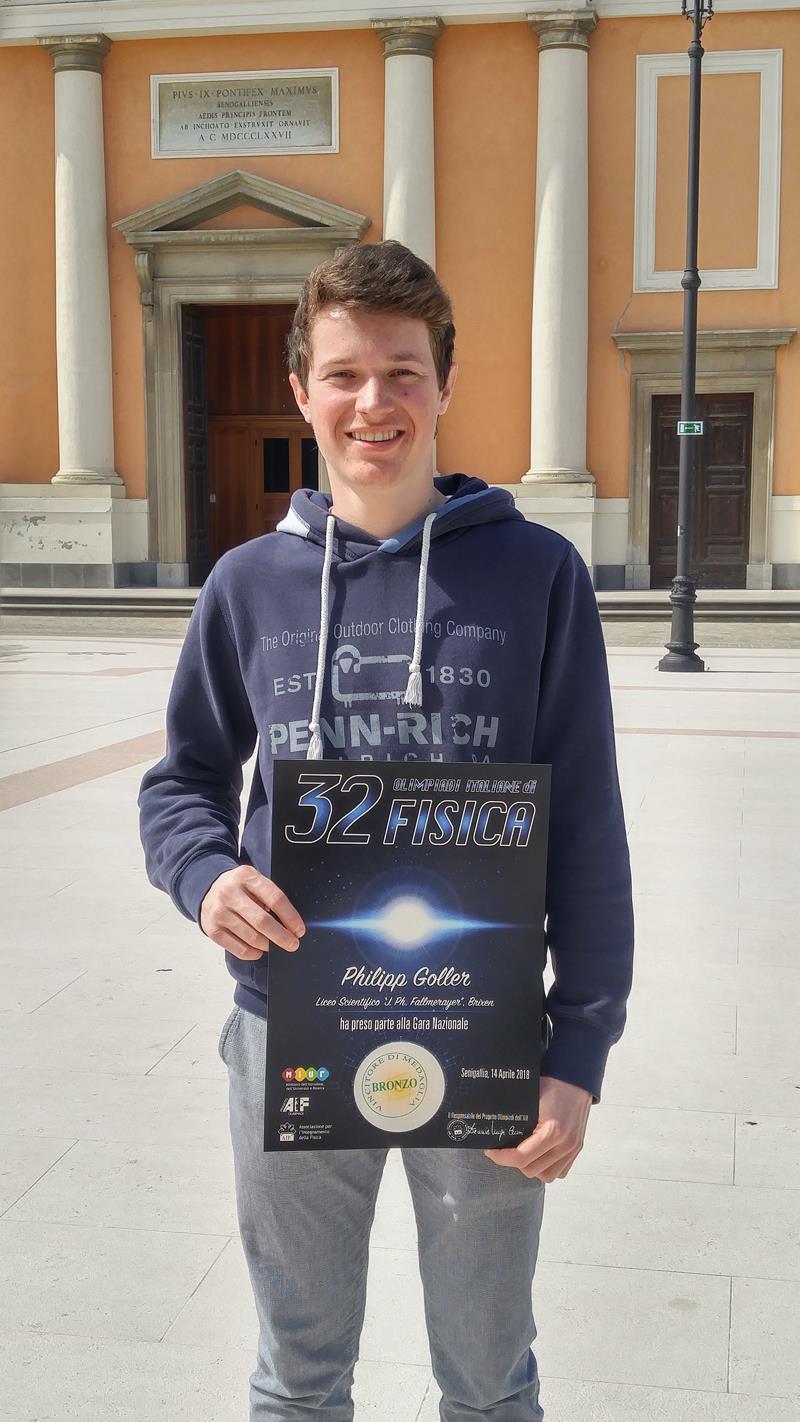 Philipp Goller del Liceo scientifico "Fallmerayer" di Bressanone ha vinto la medaglia di bronzo alle Olimpiadi della fisica nazionali a Senigallia.