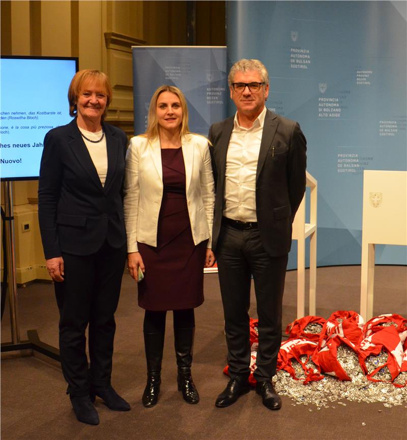 "Nell’arco di un anno sono state raccolte oltre 180.800 linguette delle lattine di alluminio, pari a 56,7 chilogrammi, che consentiranno di produrre artigianalmente circa 550 borse con un utile complessivo di 16.600 euro. Grazie a questo materiale, considerato di scarto, molte giovani donne africane potranno creare oggetti artigianali di pregio e ricavare un reddito dal loro lavoro". Lo hanno annunciato questa mattina (21 dicembre) la presidente della Commissione pari opportunità, Ulrike Oberhammer, l'assessora Martha Stocker e il presidente del Consorzio dei Comuni, Andreas Schatzer, a conclusione del progetto Sewing Hope - cucire la speranza promosso a livello internazionale dalla suora Rosemary Nyirumbe.