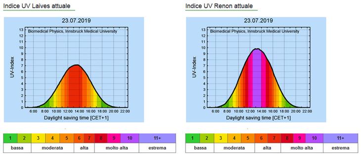 In estate, soprattutto nelle giornate di caldo torrido, a causa delle radiazioni ultraviolette UV, è necessario prestare grande attenzione ad esporsi al sole, optando solamente per alcune fasce orarie della giornata. L’Agenzia provinciale per l’ambiente pubblica online sul portale web dedicato all'ambiente, nella sezione radiazione ultravioletta, i dati in tempo reale dell’indice UV delle due stazioni di rilevamento di Laives e Renon, al fine di consentire ai cittadini di informarsi e assumere comportamenti più consapevoli rispetto alla propria esposizione ai raggi solari. Sullo stesso grafico è presentata la previsione in caso di cielo sereno senza nuvole, viene pubblicato l’andamento dell’indice UV del giorno precedente, il valore massimo giornaliero degli ultimi 30 giorni e i valori medi e massimi mensili dell’anno precedente. La pubblicazione viene fatta in collaborazione con l’Università di Innsbruck, sezione di fisica biomedica. "Occorre essere sempre consapevoli dei rischi a cui ci esponiamo quando prendiamo il sole – spiega l’assessore Giuliano Vettorato – questo servizio dell’Agenzia per l’ambiente è molto prezioso e permette di farci trovare preparati per una corretta esposizione".