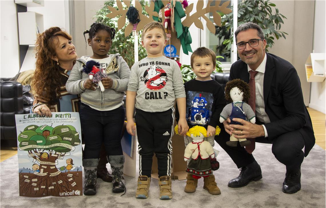 In occasione dei 30 anni della Convenzione ONU sui diritti dell’infanzia e dell’adolescenza, una piccola delegazione UNICEF guidata da Patrizia Daidone, nel pomeriggio ha portato simbolicamente al presidente un albero di cartone – l’albero dei diritti dei bambini – e due “pigotte”, bambole di pezza fatte a mano dai volontari che possono essere “adottate” dietro un’offerta minima di 20 euro. Le due bambole “personalizzate” portavano i nomi del presidente, Arno, e della moglie, Nadja.
