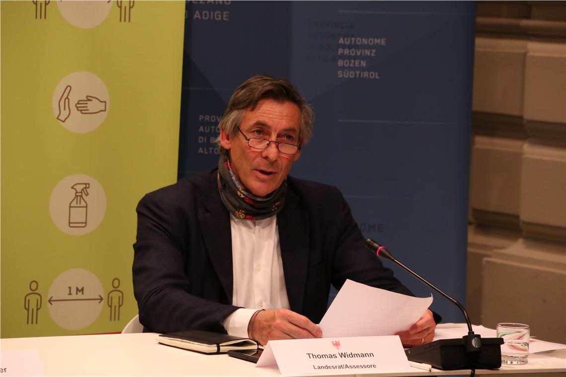 Il presidente Arno Kompatscher, l'assessore Thomas Widmann e il direttore dell'Azienda sanitaria Florian Zerzer, nella conferenza stampa virtuale hanno fatto il punto della situazione-Coronavirus
