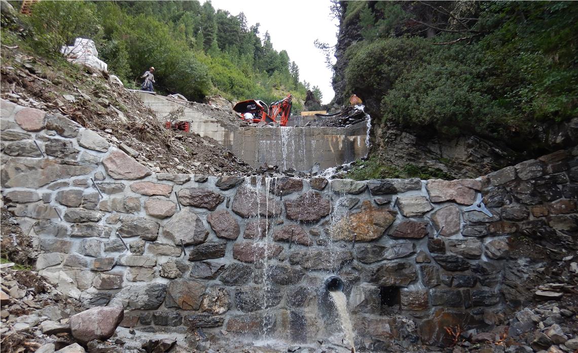 “Quest’estate abbiamo risanato le briglie rimaste. È stato necessario l’impiego dell’elicottero per il trasporto del materiale necessario e molti interventi manuali”, spiega Philipp Walder, progettista e direttore lavori. Nel progetto sono stati investiti 130.000 euro. I lavori sono stati avviati in giugno e hanno comportato l’eliminazione della vegetazione, la ripulitura delle con l’aria compressa delle fughe delle vecchie briglie in muratura mista, e, quindi, la loro sistemazione. In alcuni casi sono si è dovuto provvedere alla ricostruzione di parti crollate.