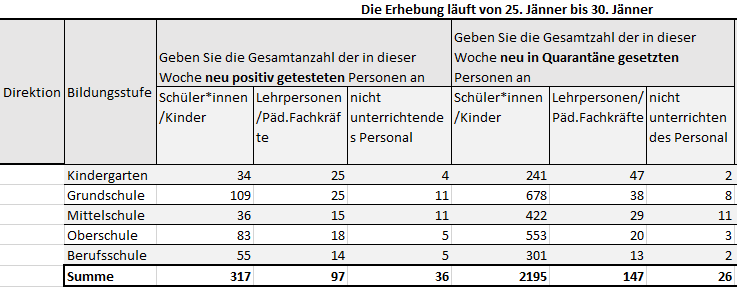 Nella settimana, tra il 25 e il 30 gennaio sono state registrate 450 nuove infezioni da Covid-19 nelle scuole in lingua tedesca dell'Alto Adige. Sono state inoltre collocate in quarantena preventiva quasi 2.509 persone. I numeri resi noti settimanalmente dalla Direzione istruzione e formazione tedesca includono l'intero corpo docente, il personale non insegnante, nonché bambini e ragazzi dalla scuola dell’infanzia alle scuole superiori.