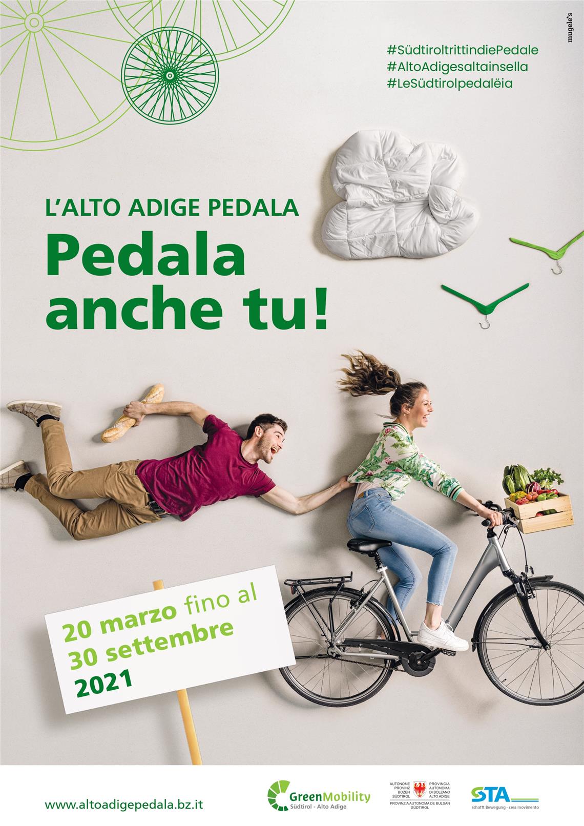 Si può pedalare durante tutto l’anno – non importa se con la forza dei propri muscoli o con pedalata assistita, per andare al lavoro o nel tempo libero. Per invogliare più altoatesine e altoatesini possibile ad andare in bicicletta, ci saranno di nuovo diverse azioni nell'ambito de L'Alto Adige pedala: “Prova una e-bike anche tu”, “Vai anche tu in bici al lavoro” e “Pedala coi guanti anche tu”. Per tutte le azioni de L’Alto Adige pedala valgono le disposizioni Covid-19 in vitore. L’Alto Adige pedala è organizzato da Green Mobility della STA - Strutture Trasporto Alto Adige.