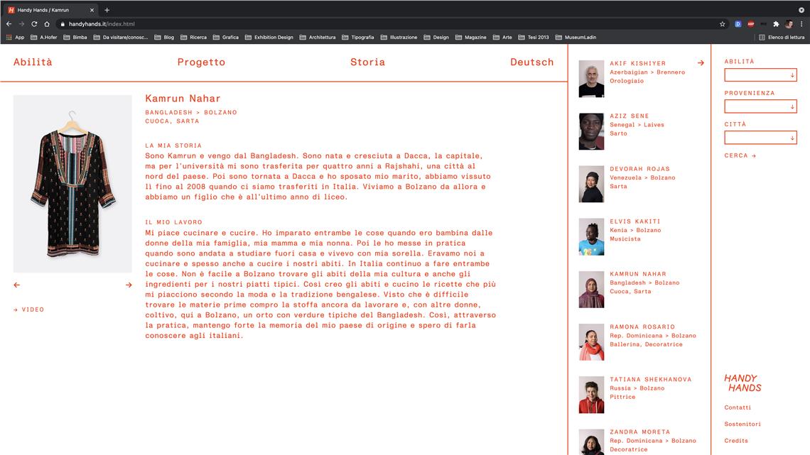 Il sito web Handy Hands amplia le riflessioni e i risultati raccolti durante la prima esperienza, estendendo la tematica del gesto a tutte le attività che passano attraverso le mani e cioè il lavoro, l’artigianato, l’arte, la musica. I racconti e le immagini presenti nel sito restituiscono le storie e le abilità delle otto persone che hanno partecipato a questa seconda tappa, tutte accomunate dall’avere appreso nel proprio paese di origine una abilità manuale, che da vera professione ora è divenuta un “saper fare” limitato per lo più alla sfera privata, con il rischio di abbandono.