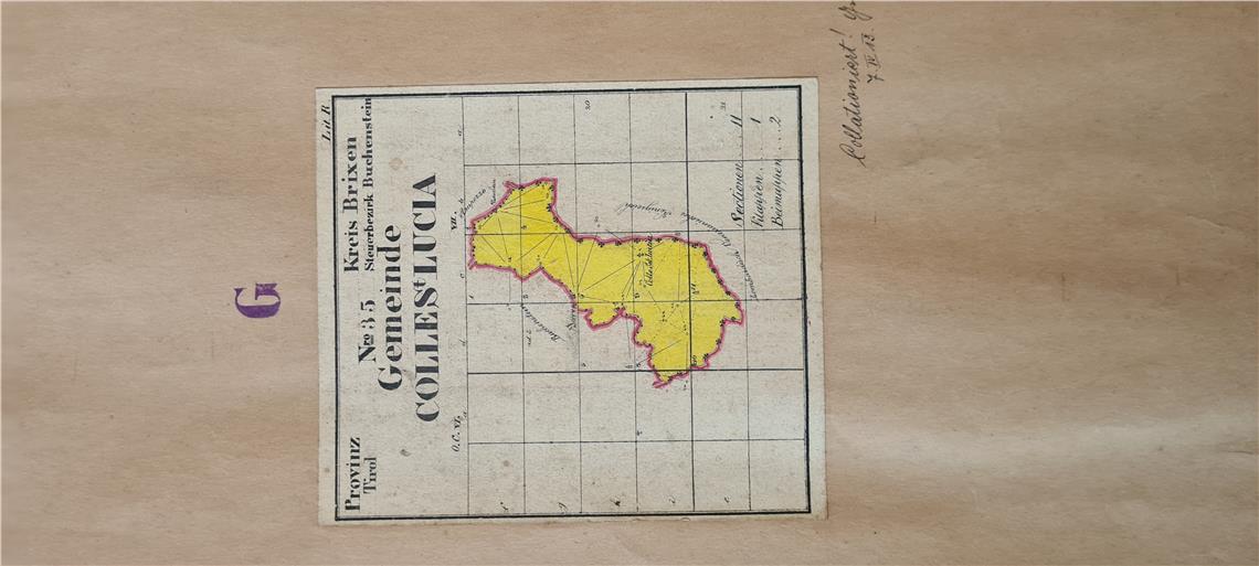 Martedì 1° maggio, presso l’archivio della Corte d’Appello di Trento, sono state ritrovate le mappe storiche del Comune ladino Colle Santa Lucia (Versail in tedesco), il quale – assieme a Cortina d’Ampezzo e Livinallongo – fa parte oggi della provincia di Belluno. Durante l’Impero Austro-Ungarico Colle Santa Lucia era di competenza della circoscrizione giudiziaria di Bressanone, ma con la fine della prima Guerra Mondiale il Comune venne formalmente annesso al Regno d’Italia. L’attività di rilevamento topografica è stata effettuata nel 1858, mentre la restituzione cartografica risale al XX secolo.
