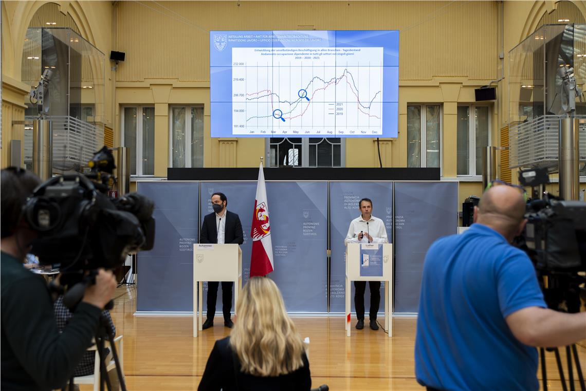 Il rapporto sul mercato del lavoro appena pubblicato, fotografa la situazione in provincia di Bolzano nel semestre novembre 2020-aprile 2021 e fornisce un quadro sulla stagione invernale 2020/2021, priva di turisti. Il mercato del lavoro risulta diviso: il risultato del semestre è fortemente negativo, ma c'è motivo per un certo ottimismo. L'assessore provinciale Philipp Achammer insieme al direttore della Ripartizione lavoro Stefan Luther oggi (10 giugno) in conferenza stampa, hanno illustrato gli sviluppi più recenti. La notizia positiva che hanno voluto evidenziare è il trend positivo che si registra nel mercato del lavoro a partire dall’inizio di aprile 2021 con un costante e rapido aumento dei rapporti di lavoro e dell’attivazione di contratti di lavoro. "Dall'inizio di giugno - ha spiegato Achammer - l’Alto Adige ha quasi raggiunto nuovamente il numero di occupati del 2019, fatto che dimostra come la nostra economia ed anche il settore turistico si riprendono bene e in tempi relativamente brevi”. Questo ottimismo viene condiviso da Stefan Luther: "Da inizio aprile, a prescindere dal comparto turistico, si è verificato uno sviluppo dinamico in tutti i settori che non ci aspettavamento con questa rapidità".
