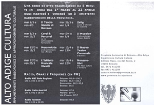 Dopo il successo della promozione della cultura in tv, la Ripartizione provinciale Cultura italiana avvia ora anche via radio il progetto di diffusione delle informazioni di carattere culturale. Gli appuntamenti radiofonici di approfondimento, che presentano realtà culturali consolidate sul territorio e nuove iniziative, hanno una durata di 5 minuti e andranno in onda per 8 settimane, a partire da martedì primo marzo, su tre emittenti radiofoniche private.