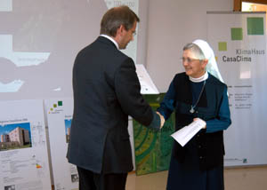 LPA - Das beste Südtiroler KlimaHaus des Jahres 2004 steht in Meran. Die Rede ist Vinzenzheim der Barmherzigen Schwestern in der Laurinstraße. Landesrat Michl Laimer und Amtsdirektor Norbert Lantscher haben am heutigen Freitag, 20. Mai 2005, den Preis „Bestes Klimahaus“ Schwester Sieglinde, der Provinzoberin der Barmherzigen Schwestern, übergeben. Zugleich wurde der Sonderpreis für klimaverträgliche Renovierung und Erweiterung verliehen.