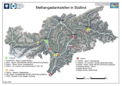 Südtirols Methan-Tankstellennetz zählt mittlerweile bereits vier Verteiler: jeweils einen im Gewerbegebiet Bozen-Süd, im Burggrafenamt auf der Schnellstraße Mebo bei Algund, in Sinich und nunmehr auch einen in St. Lorenzen. Weitere Zapfstellen sollen in nächster Zukunft ihren Betrieb aufnehmen, davon noch eine im Pustertal (Bruneck/Nordring) und eine im Eisacktal. Vier weitere Methanverteiler befinden sich in Planung, drei davon im Unterland und einer in Naturns/Vinschgau.